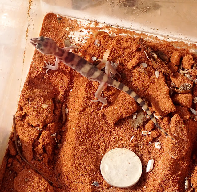 February 22, 2025バンドトカゲモドキの点検。来て9日目のColeonyx variegatus v. , wetShelter から顔を出さない。シェルターをはずして点検してみた。動き回るので、tg-6 の連写の1枚を。--f13, 1/80, iso200 で撮れた。-尻尾の付け根に棘状のもの。まだ未成熟だが・・オスなのだろうか??そういえば、Coleonyx はXY型の性染色体で雌雄決定されると論文がある。-------------