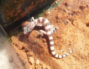 May 9, 2025もう1頭のバンドトカゲモドキ 2nd 個体。tg-6, 連写の1枚。--(Ca++ dusted) mealy about10mm-length をよく喰べる、よい仔。----もう1頭は、「砂漠」にしすぎたようで、脱皮不良。wetShelter の個体差で、内部湿度不十分で。餌の後は、shelter 入口にspray して水を補給しないと消化不良になるようだ。mealy を吐き戻した。-------