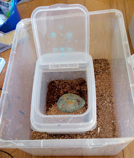 2つ使っていて、1つは上の画像の通り外にもうひとつ大きなプラ箱に入れていた。こっちのほうは、外箱がバーミキュライト敷きなので外ケースの下に潜り込んだいた。無事救出。